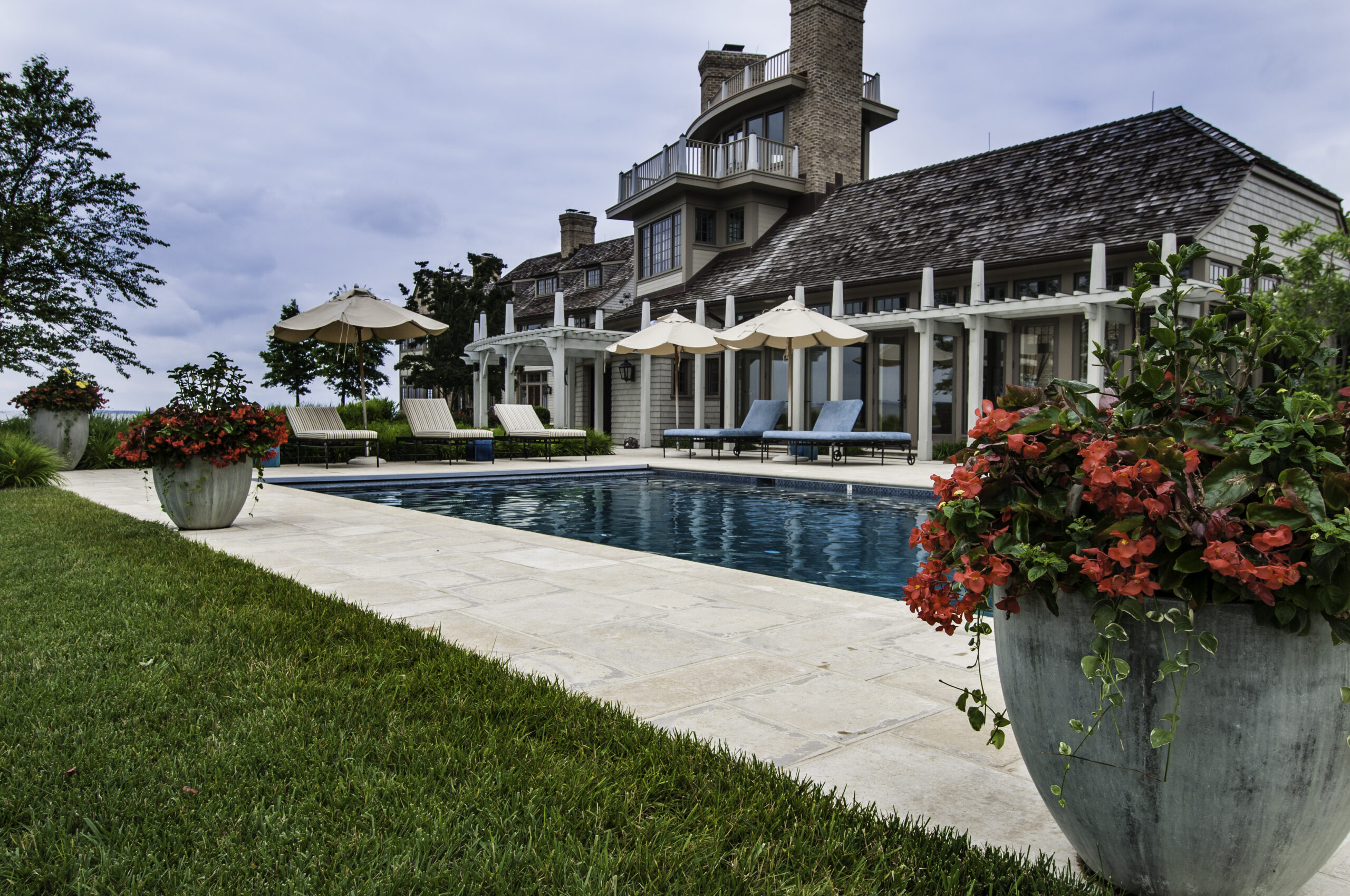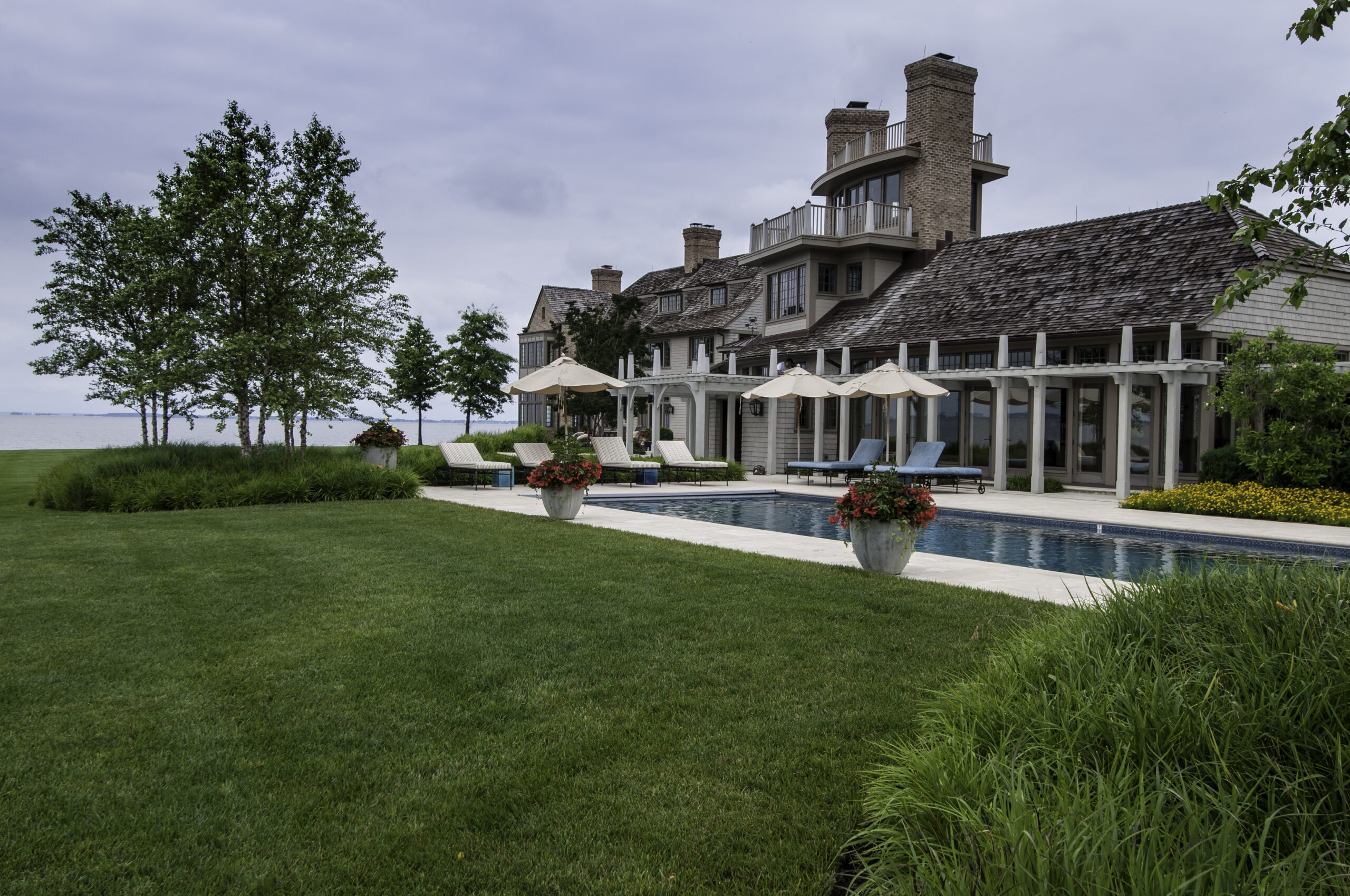 Nuestros equipos de diseño, construcción y mantenimiento han estado mejorando esta apartada propiedad frente al mar desde 2008. El alcance original del trabajo de diseño y construcción incluÃa el trasplante de quince arces rojos de calibre 8″ existentes y la construcción de una cocina al aire libre y una pérgola, una piscina, un pozo de fuego, un camino de entrada y extensas plantaciones ornamentales en toda la propiedad. Además, hemos nivelado, tepes y regado más de nueve acres de la propiedad. Nuestros equipos de mantenimiento se encargan semanalmente del cuidado del jardÃn y del césped, de la gestión del agua y del cuidado de los cenadores. Esta finca privada frente al mar se ha convertido realmente en un refugio lujoso y elegante.