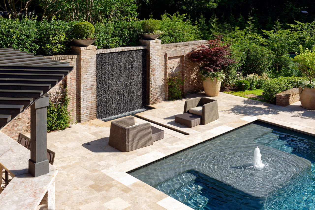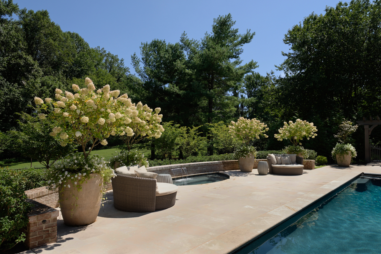 The existing landscape of this thirty-year-old Virginia home was outdated and lacked character. The client tasked us with giving the entire five-acre property a dramatic facelift, focusing on high-quality materials and exceptional craftsmanship. Completed in 2018, this transformation includes travertine walkways and patios, a solid cedar pergola, a new pool with water features, an outdoor kitchen, a granite cobblestone and gravel driveway, and lush, flowering ornamental plantings. Since the project’s completion, our maintenance crews have continued to ensure the property remains pristine year-round.